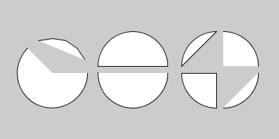 x, y, radius, start_angle, sweep = 75, 105, 50, 0, PI + QUARTER_PI circle_arc(x, y, radius, start_angle, sweep) # default 'arc' wrapper mode circle_arc(x, y, radius, -QUARTER_PI / 2, -HALF_PI, arc_func=p_arc, num_points=4) x, y1, y2 = 190, 95, 105 half_circle(x, y1, radius, TOP, CHORD) # default 'arc' wrapper mode half_circle(x, y2, radius, BOTTOM, arc_func=b_arc) x1, x2, y1, y2 = 300, 310, 95, 105 quarter_circle(x1, y1, radius, TOP + LEFT, CHORD) # default 'arc' wrapper mode quarter_circle(x1, y2, radius, BOTTOM + LEFT, PIE) quarter_circle(x2, y1, radius, TOP + RIGHT) quarter_circle(x2, y2, radius, BOTTOM + RIGHT, arc_func=b_arc) -