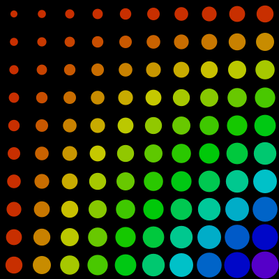 É possível também fazer uma "fila de colunas", mudando só a ordem de encaixa dos laços (e ordem em que os círculos são desenhados) mas não o resultado visual final. Veja um exemplo, um pouco ampliado, em que a posição do elemento altera a cor e o tamanho: