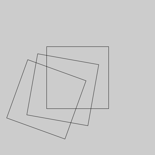 Então, vamos usar a função rotate(), e em seguida vamos desenhar um quadrado com os mesmos argumentos novamente ("quadrado 1"). Por fim, vamos repetir tanto a rotação como o a chamada de função que desenha o quadrado mais uma vez ("quadrado 2").