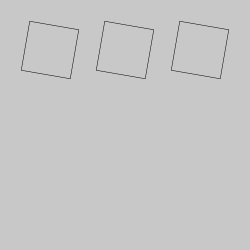 Cada chamada a função quadrado_girado_errado() empurra a origem do sistema de coordenadas mais um pouco, e também gira 10 graus, então o segundo quadrado girado cai mais longe e mais girado, o terceiro já fica para fora da tela, mais abaixo à direita!