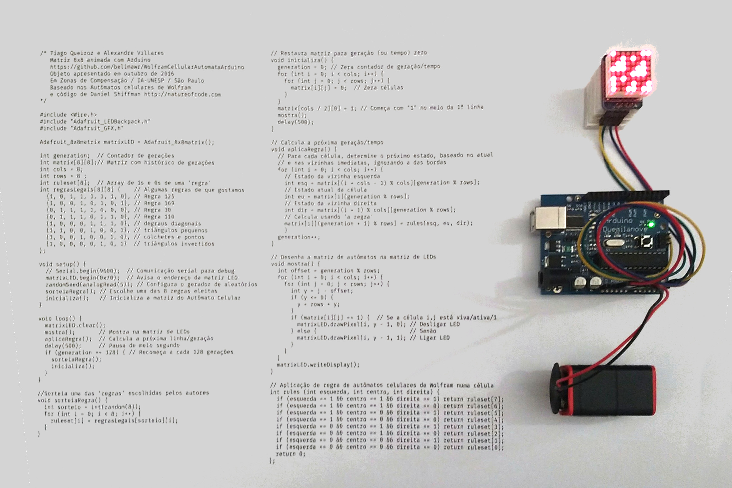 A obra implementa uma conjunto 'curado' de regras do autômato celular de Wolfram em uma matriz de LED, apresentada com o código fonte, que também fica disponível no repositório WolframCellularAutomataArduino.