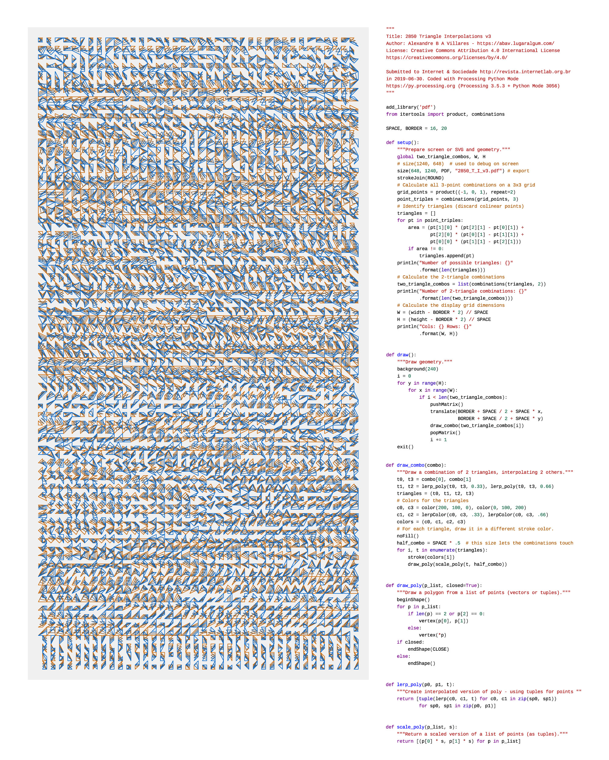 "Uma obra de artes visuais no domínio das novas mídias, pode também ser descrita como uma obra algorítmica. Executada no contexto da exploração gráfica da combinatória de elementos por meio da programação. Reflete também preocupações do autor com o compartilhamento do conhecimento, licenciamento de artefatos culturais, uso de ferramentas livres, acesso ao código fonte e desmistificação dos procedimentos algorítmicos."