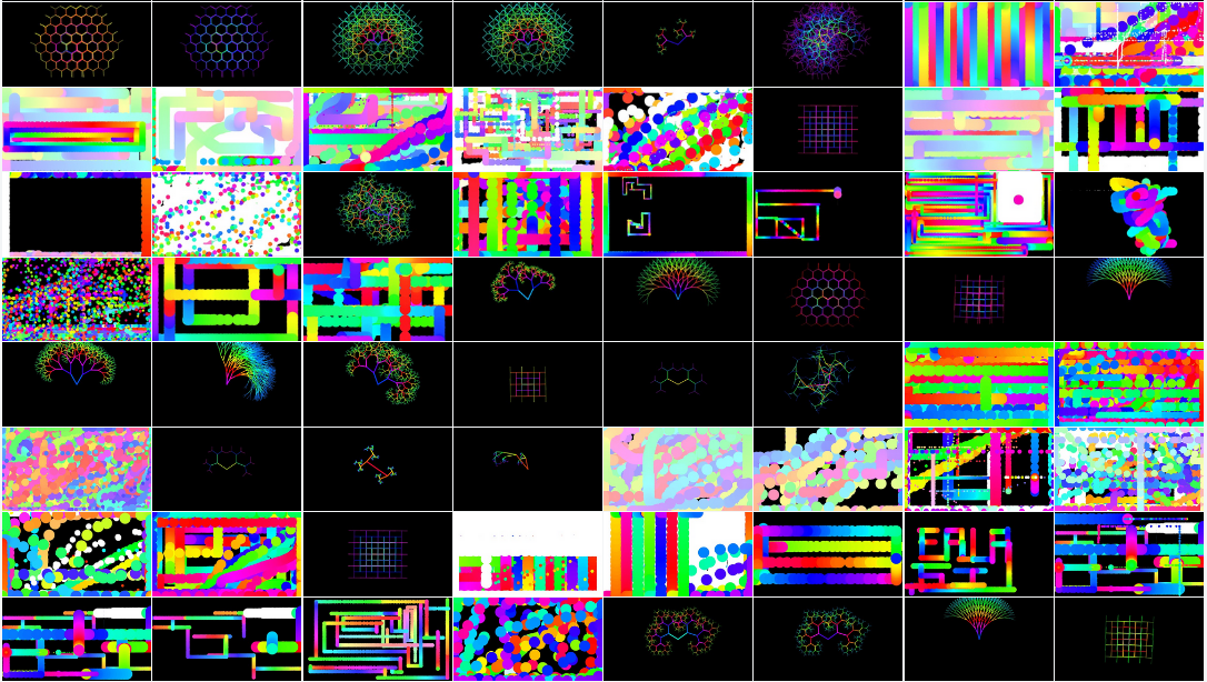 Série de obras algorítmicas, ou computacionais, com origem nos estudos diários do projeto sketch-a-day em 2018, e cujos desobramentos permitiram variantes em movimento, desenhos realizados com plotter de caneta e impressões únicas em papel fotográfico.