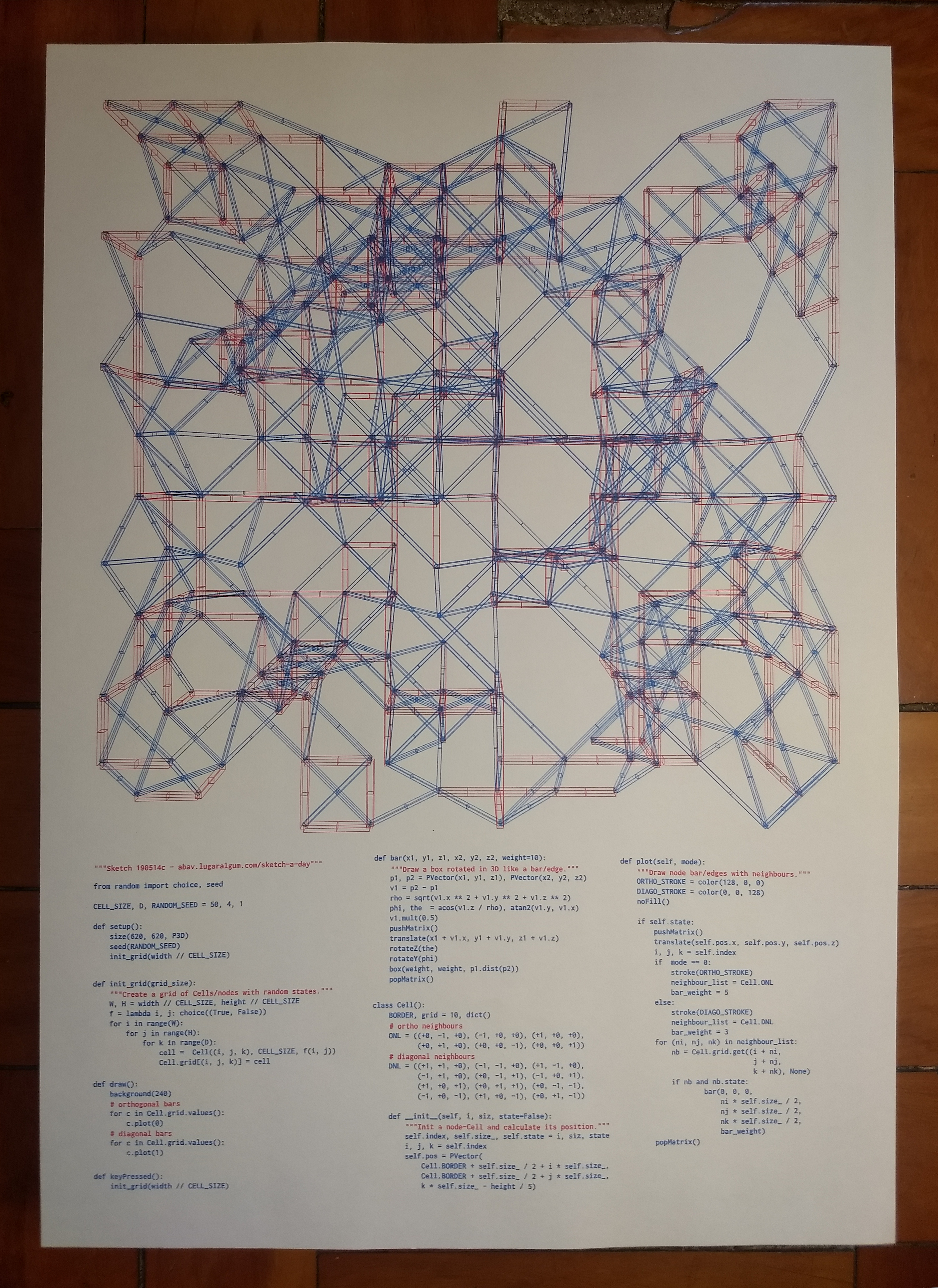 Impressão em risografia de um sketch, tiragem de 30 exemplares. Inclui o código que produz a imagem.